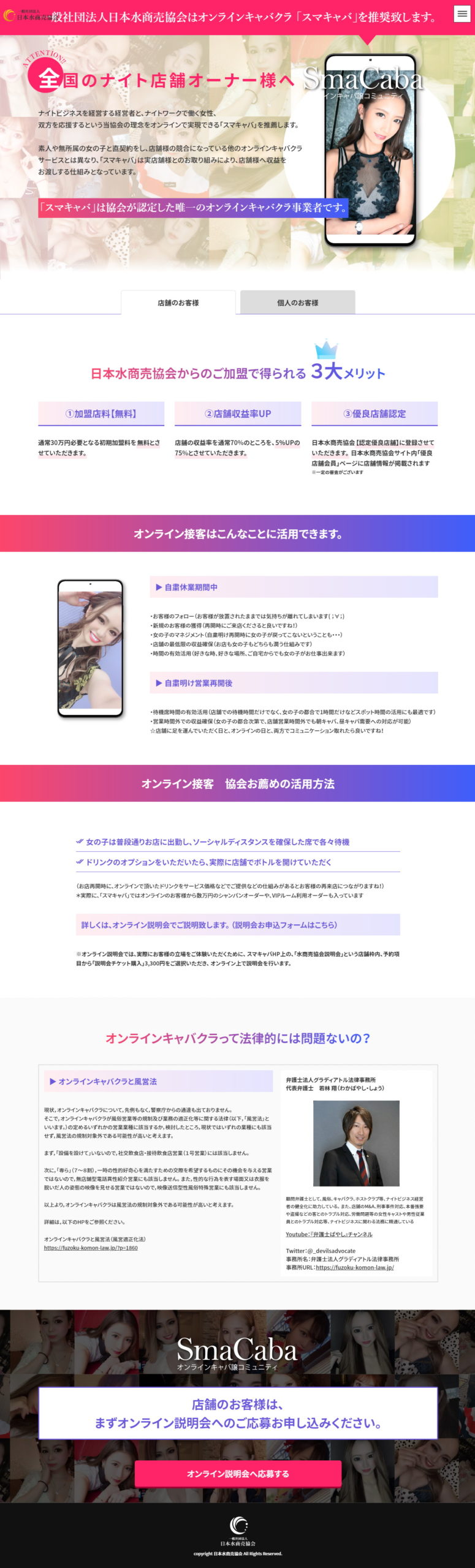 オンラインで接客ができるナイトワーカー向けサービス「SmaCaba」様のLPページを制作させていただきました。