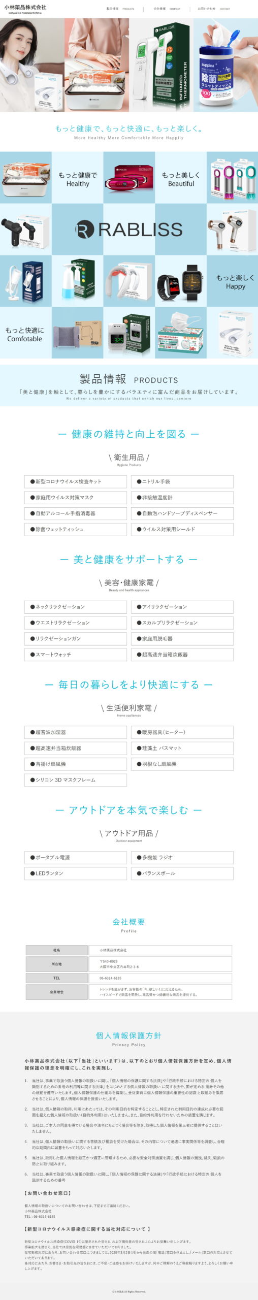 小林薬品様のコーポレートサイト件、商品紹介サイトです。 Wordpressベースで商品を登録できるようになっており、管理画面より 商品を登録することにより、TOPページへ自動的にリンクが追加され、 各カテゴリの商品一覧にも追加されます。